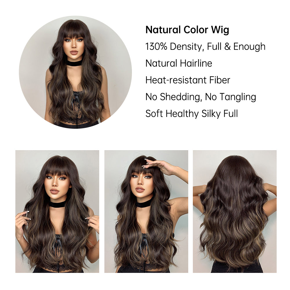 LC1029-1 26 Inches Long Curly Brown Wigs with Bangs and Black Roots Synthetic Wigs Women's Wigs for Daily or Cosplay Use