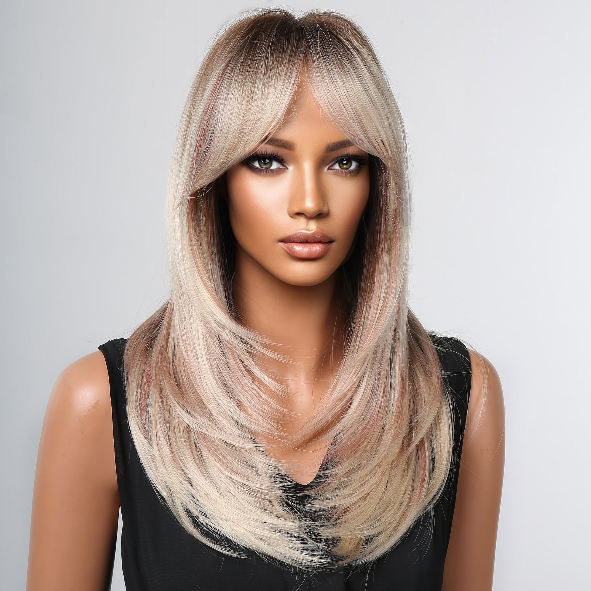 LC2068-12 20 Inches Long Straight Blonde Synthetic Wigs with Bangs Women's Wigs for Daily or Cosplay Use