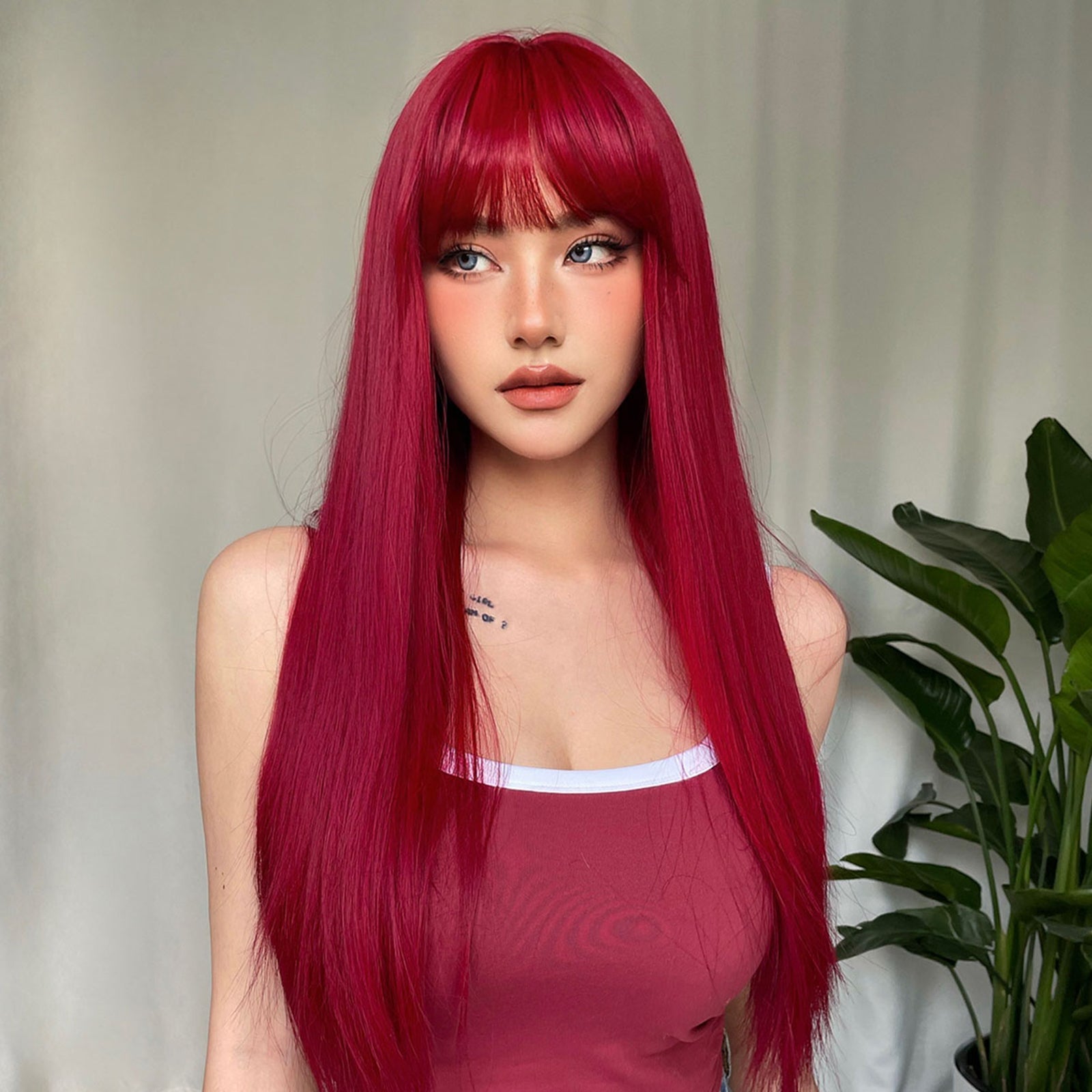 WL1084-1 18 Inch long straight wigs red with bangs wigs for women